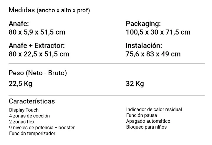 El confort se eleva con funciones diseñadas para tu tranquilidad: temporizador independiente para cada zona, indicador de calor residual, función pausa y bloqueo para niños, que hacen de la cocina un lugar seguro y confiable para toda la familia.