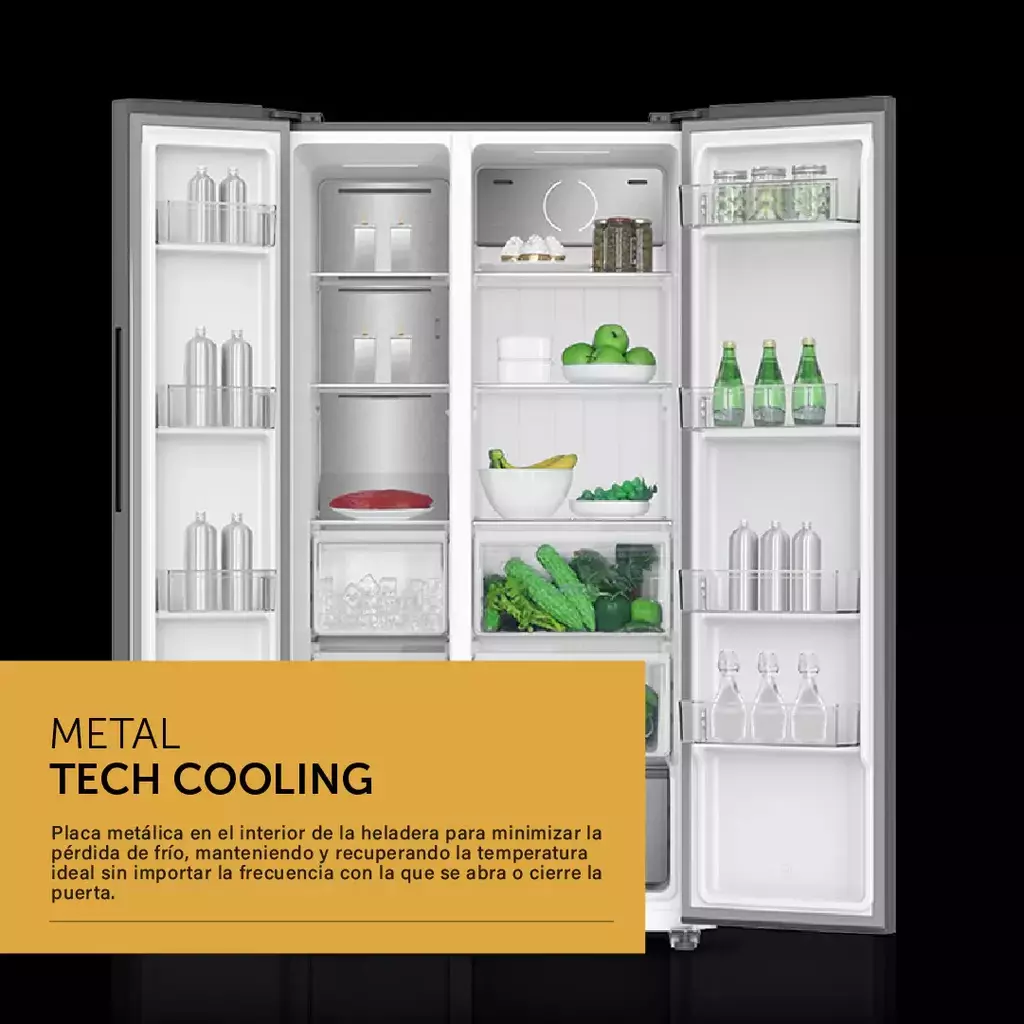 Además, cuenta con tecnología "Metal Cooling" que utiliza superficies metálicas para distribuir el frío de manera uniforme y mantener la temperatura constante. Conserva tus alimentos frescos por más tiempo, reduce el consumo energético y aporta un diseño moderno a tu cocina.