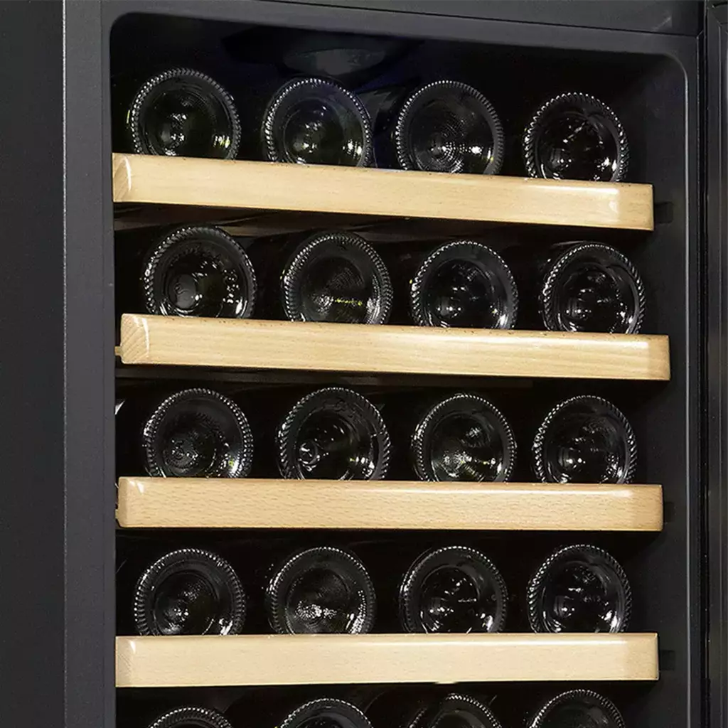 La cava T28 cuenta con capacidad para 28 botellas estándar de 750ml y 43 cm de largo.