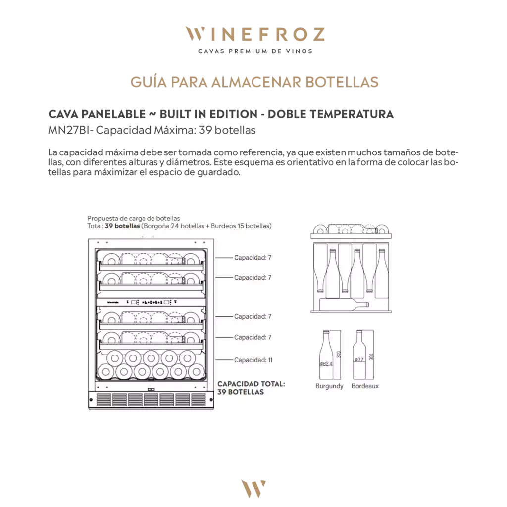 La cava BUILT IN EDITION Winefroz, modelo MN27BI, es una cava PANELABLE y EMPOTRABLE.